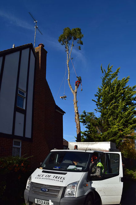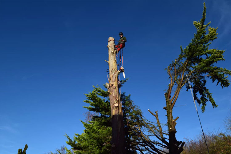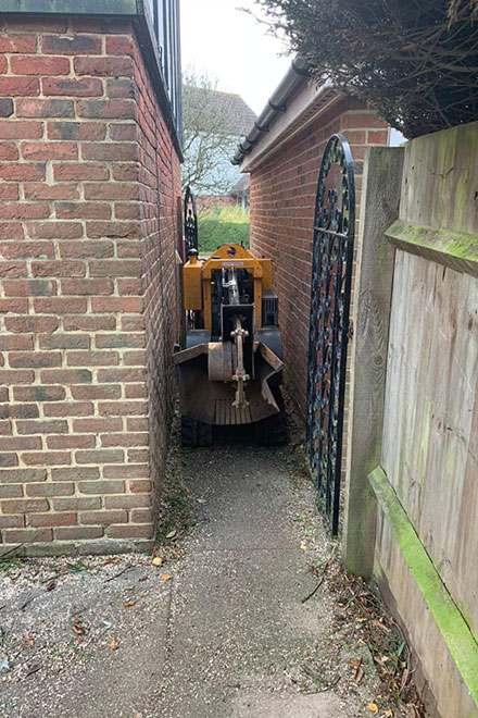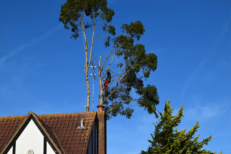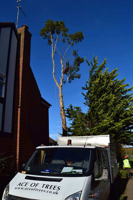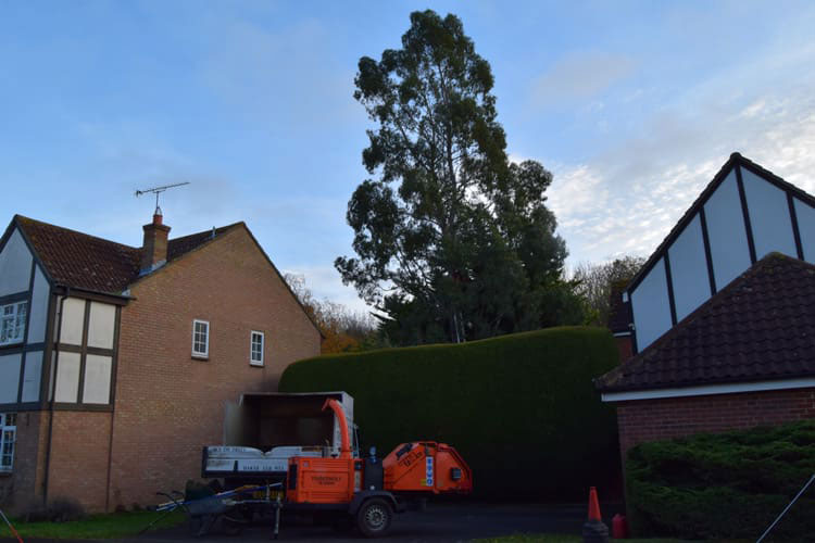 We removed this Eucalyptus tree in Stevenage, Hertfordshire due to damage to the foundations of the property. The tree was removed using a rigging system, enabling us to lower branches and logs safely to the ground to prevent damage to targets below. The stump was then ground down using our narrow access stump grinder, leaving the area reading for re-planting/landscaping.